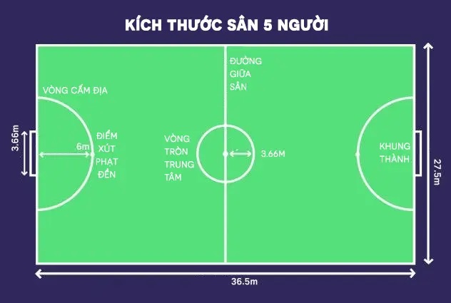 Sân cỏ nhân tạo 5 người thường có dạng hình chữ nhât, kích thước chiều dọc của sân phải lớn hơn kích thước chiều ngang của sân.